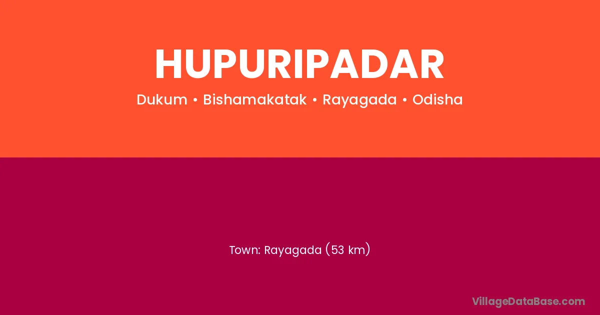 Rayagada (53 km) is the nearest town to Hupuripadar village for major economic activities and is located approximately 53 km away.