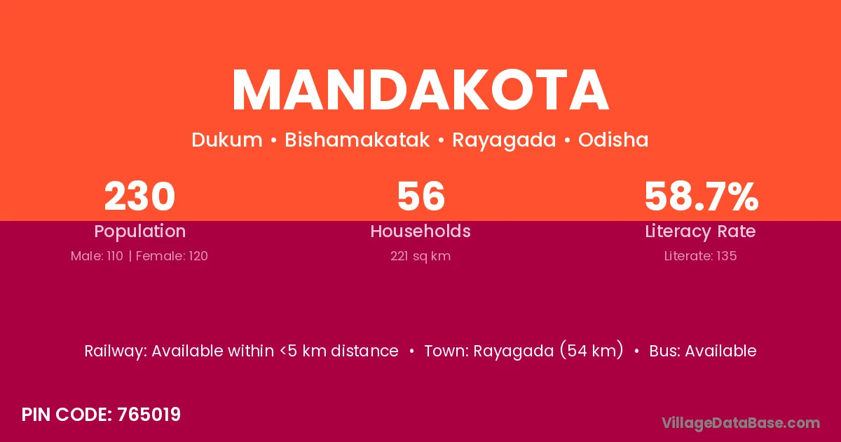 Rayagada (54 km) is the nearest town to Mandakota village for major economic activities and is located approximately 54 km away.