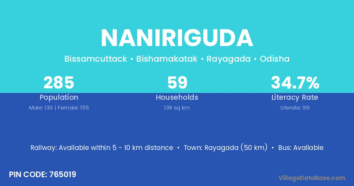 Rayagada (50 km) is the nearest town to Naniriguda village for major economic activities and is located approximately 50 km away.
