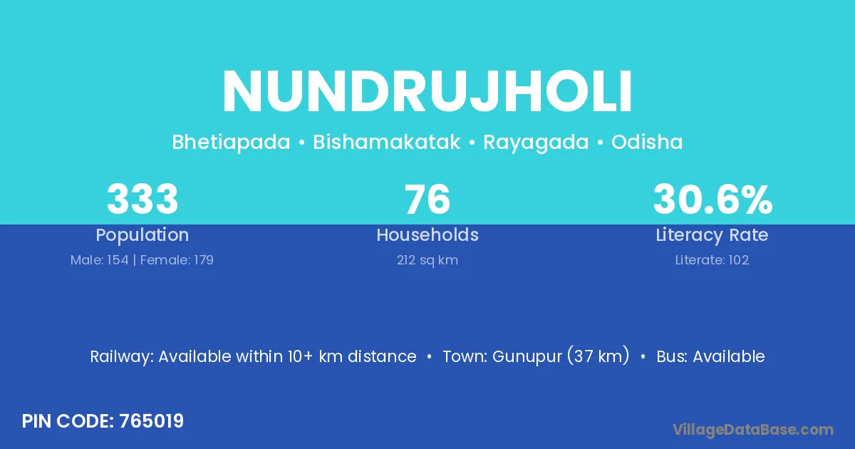 Gunupur (37 km) is the nearest town to Nundrujholi village for major economic activities and is located approximately 37 km away.