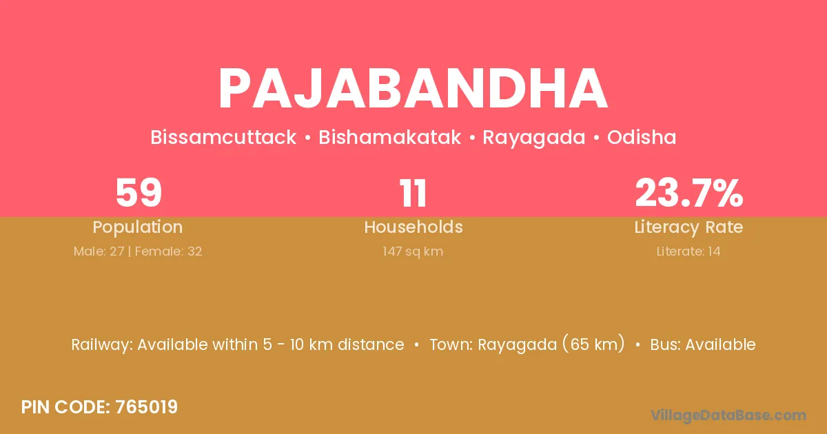 Rayagada (65 km) is the nearest town to Pajabandha village for major economic activities and is located approximately 65 km away.