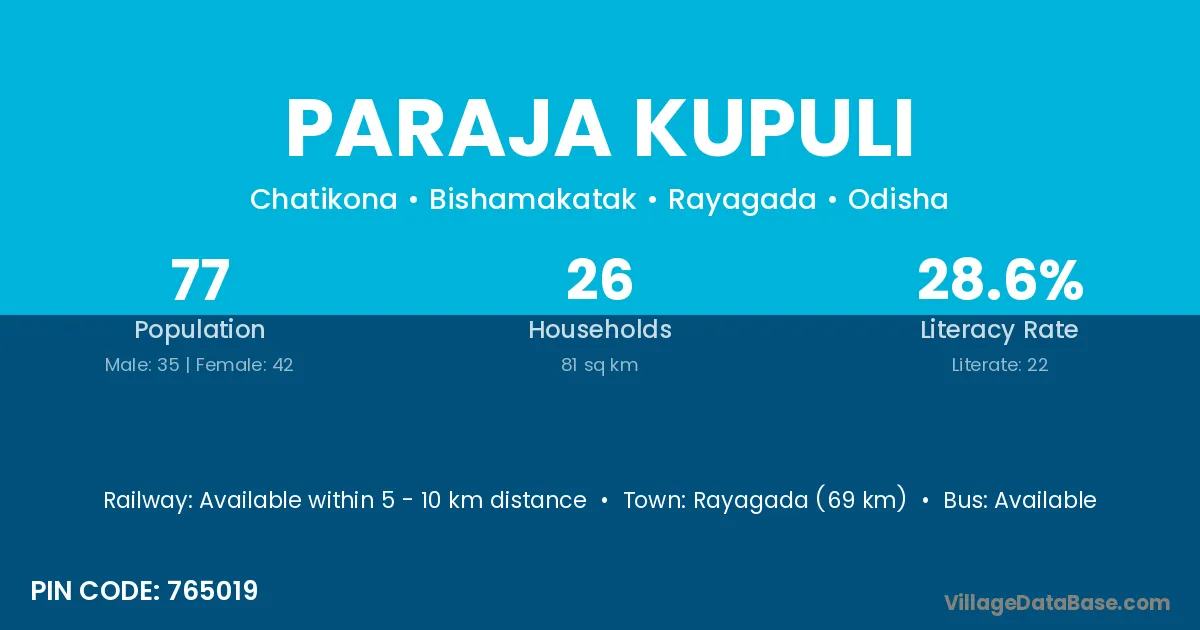 Rayagada (69 km) is the nearest town to Paraja Kupuli village for major economic activities and is located approximately 69 km away.