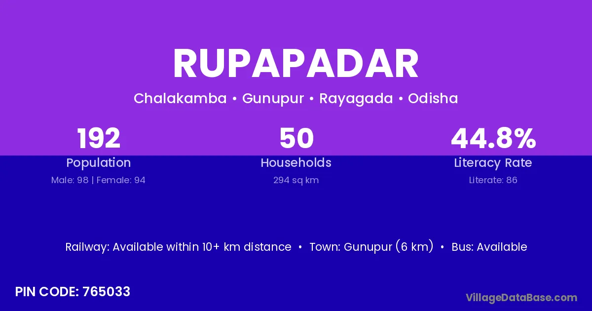 Rayagada (56 km) is the nearest town to Rupapadar village for major economic activities and is located approximately 56 km away.