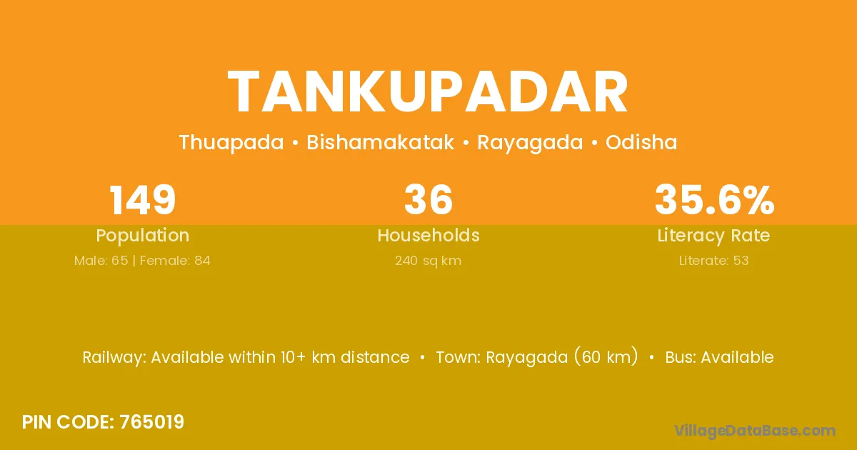 Rayagada (60 km) is the nearest town to Tankupadar village for major economic activities and is located approximately 60 km away.