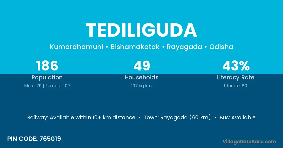 Rayagada (60 km) is the nearest town to Tediliguda village for major economic activities and is located approximately 60 km away.