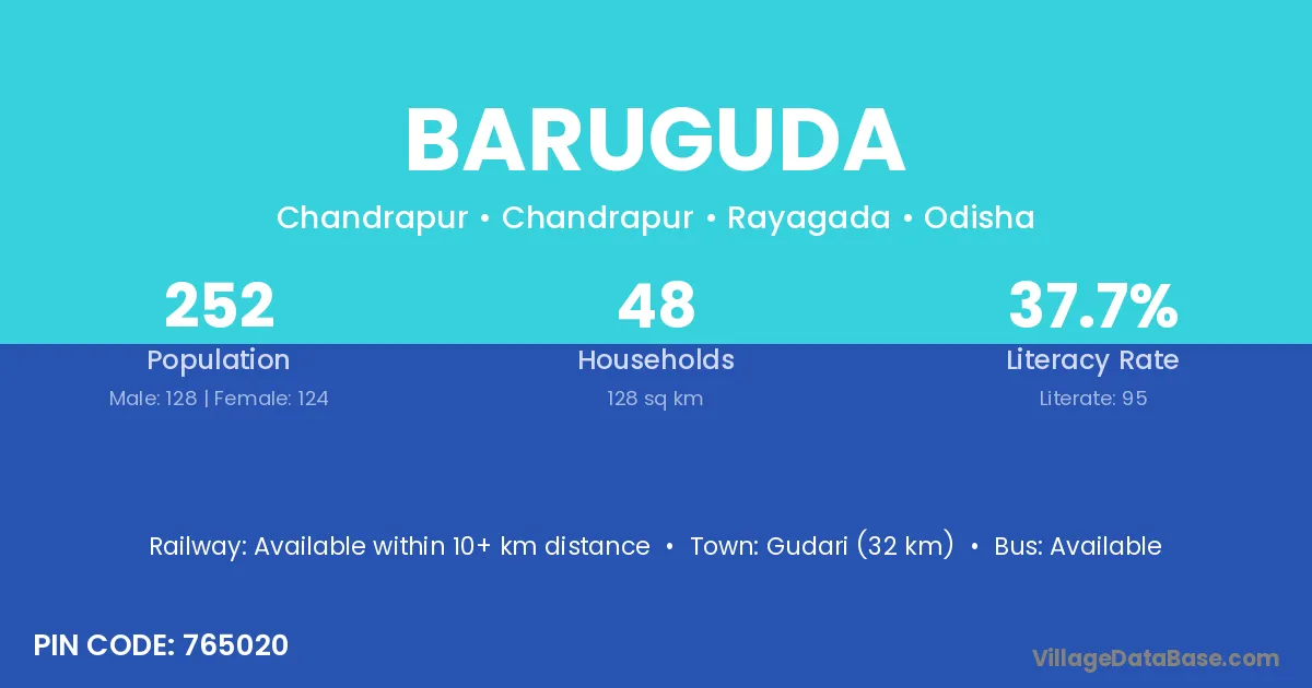 Baruguda village has a total population of 252 people, of which 128 are males and 124 are females.