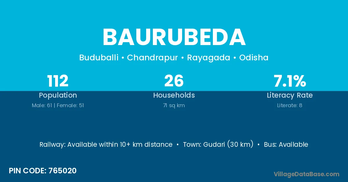 Gudari (30 km) is the nearest town to Baurubeda village for major economic activities and is located approximately 30 km away.