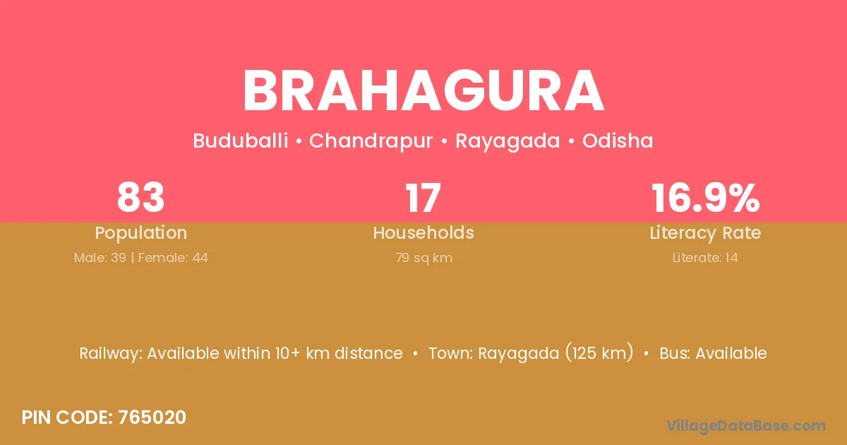 Rayagada (125 km) is the nearest town to Brahagura village for major economic activities and is located approximately 125 km away.