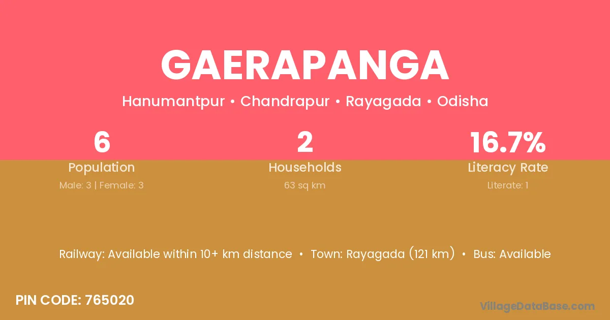 Rayagada (121 km) is the nearest town to Gaerapanga village for major economic activities and is located approximately 121 km away.