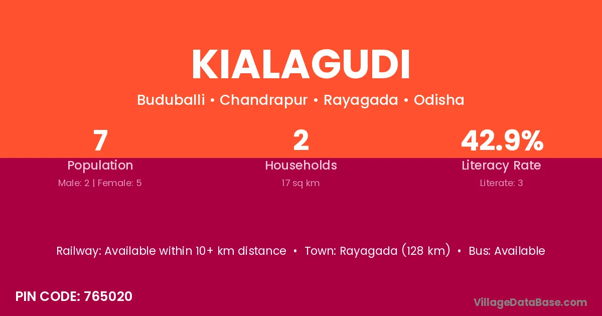Rayagada (128 km) is the nearest town to Kialagudi village for major economic activities and is located approximately 128 km away.