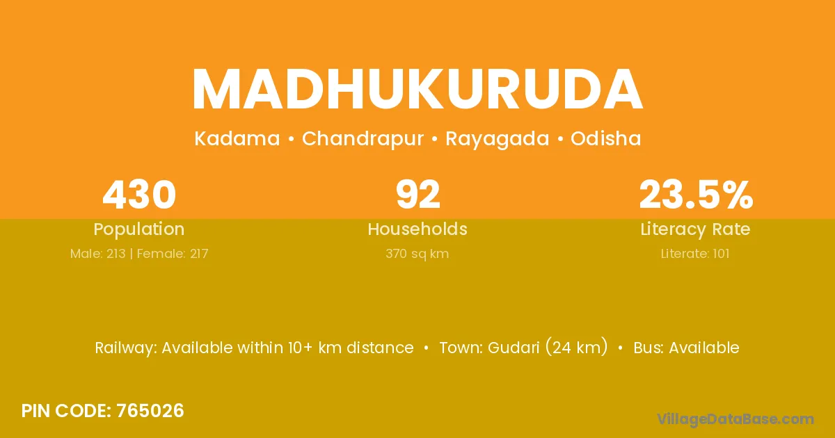 Madhukuruda village has a total population of 430 people, of which 213 are males and 217 are females.