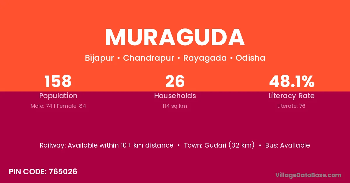 Gudari (32 km) is the nearest town to Muraguda village for major economic activities and is located approximately 32 km away.