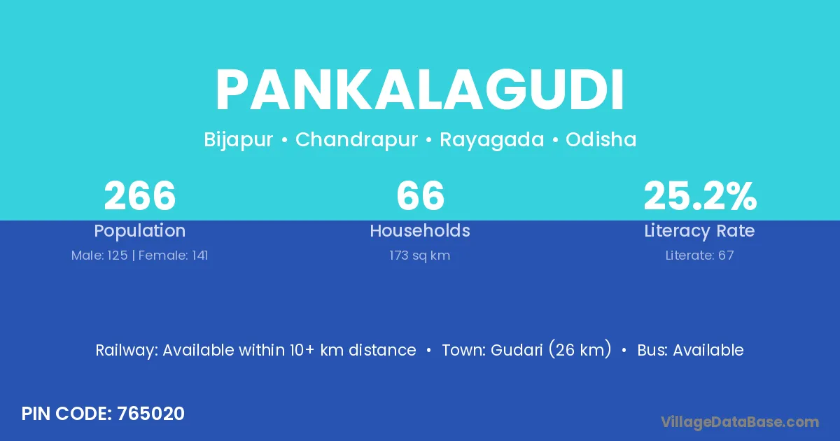 Gudari (26 km) is the nearest town to Pankalagudi village for major economic activities and is located approximately 26 km away.