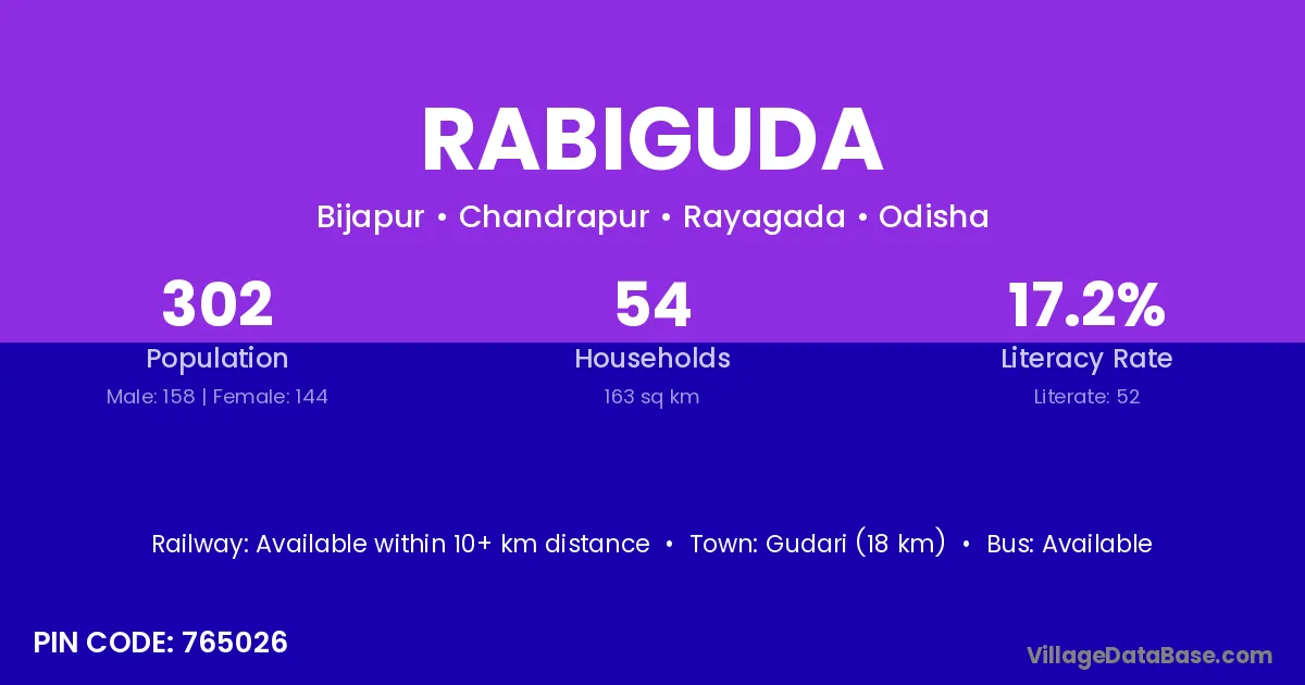 Gudari (18 km) is the nearest town to Rabiguda village for major economic activities and is located approximately 18 km away.