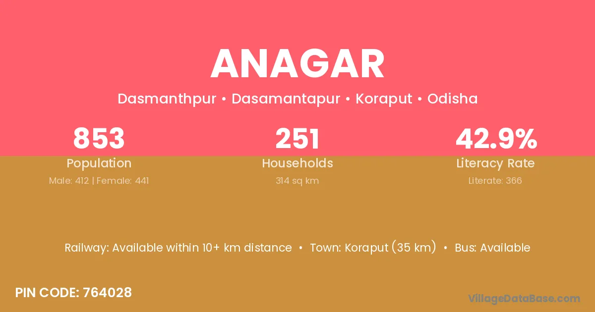 Rayagada (75 km) is the nearest town to Anagar village for major economic activities and is located approximately 75 km away.