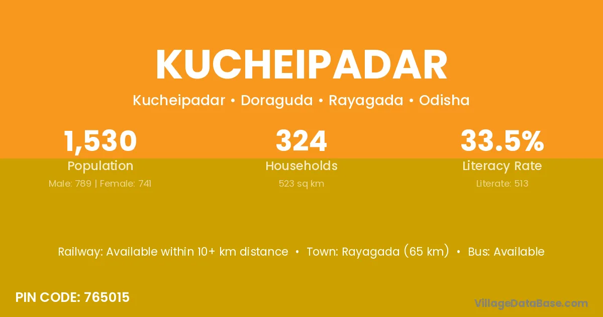 Rayagada (65 km) is the nearest town to Kucheipadar village for major economic activities and is located approximately 65 km away.