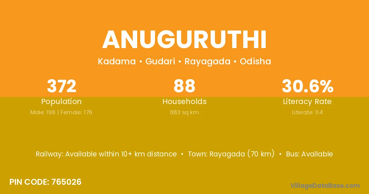 Rayagada (70 km) is the nearest town to Anuguruthi village for major economic activities and is located approximately 70 km away.