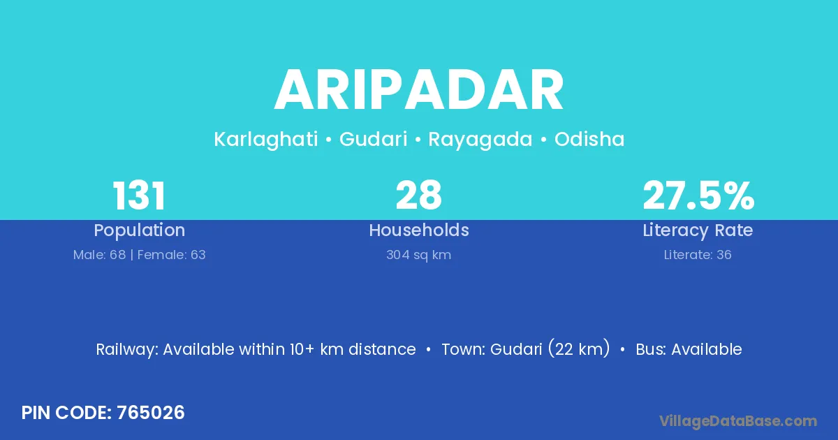 Aripadar village has a total population of 131 people, of which 68 are males and 63 are females.