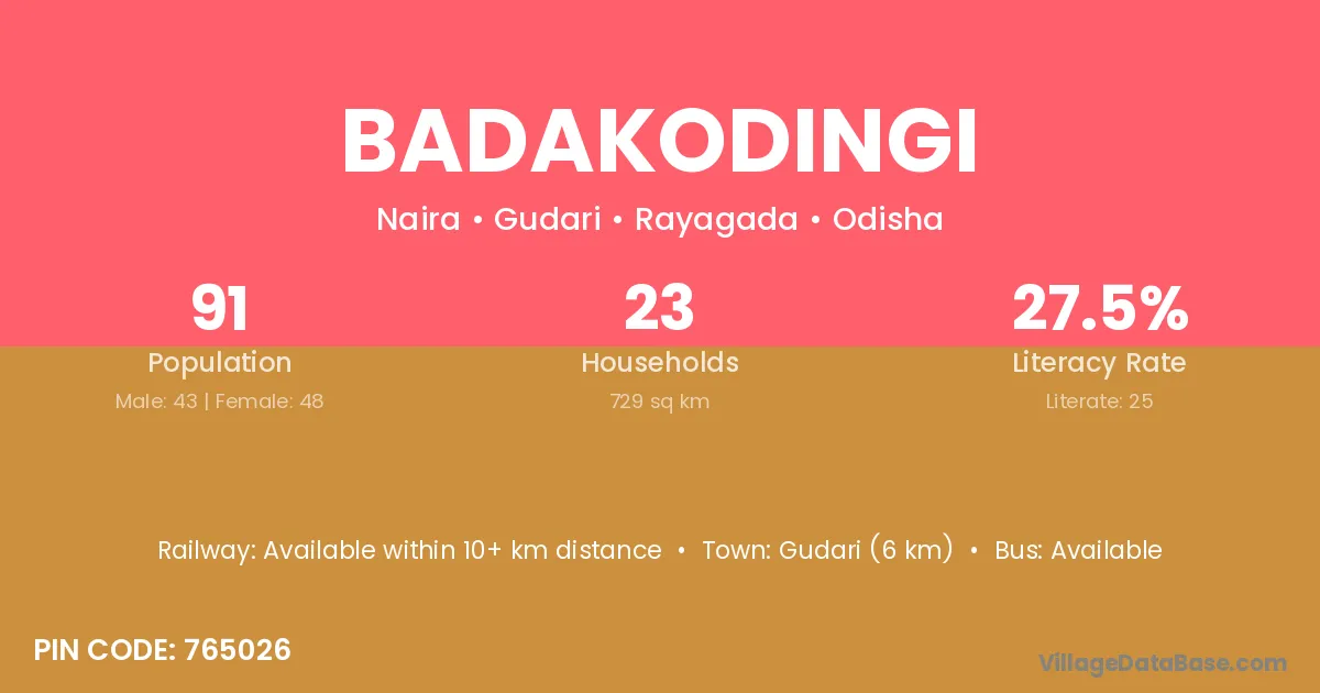 Gudari (6 km) is the nearest town to Badakodingi village for major economic activities and is located approximately 6 km away.
