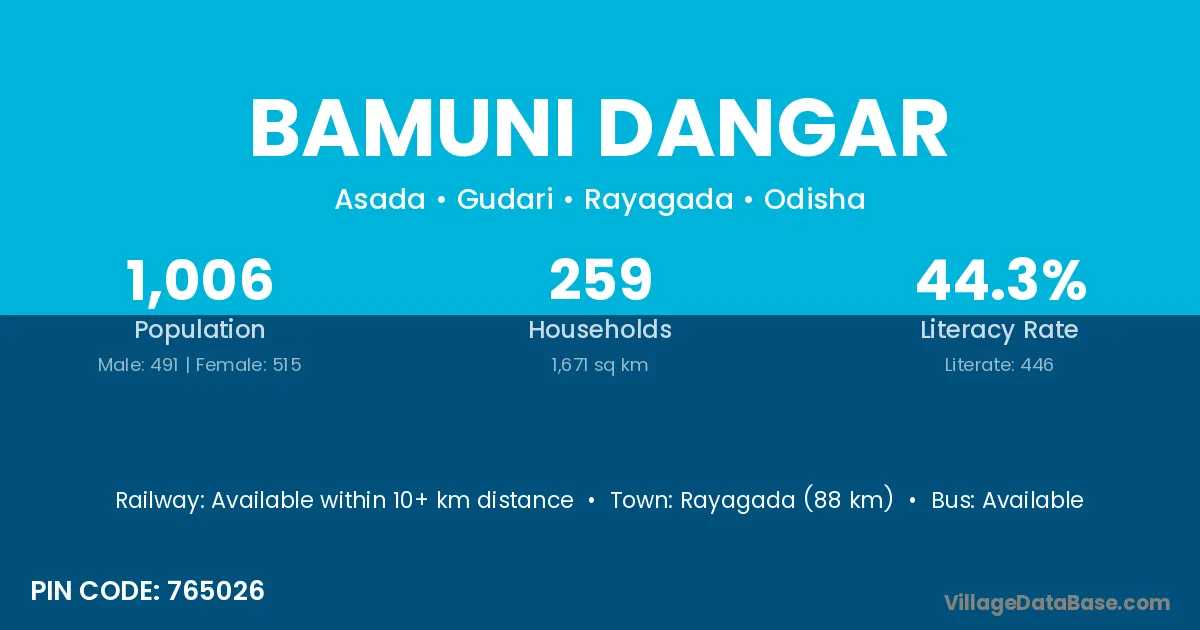 Rayagada (88 km) is the nearest town to Bamuni Dangar village for major economic activities and is located approximately 88 km away.