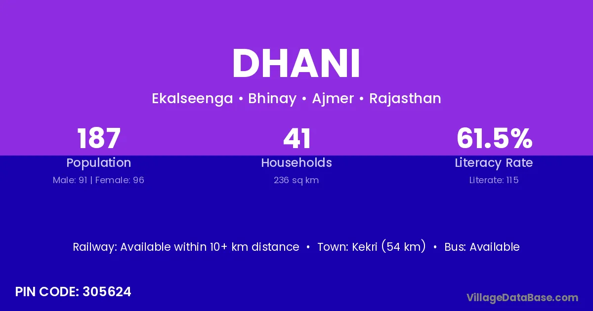 The literacy rate of Dhani village is 33.68%. Male literacy stands at 57.69% and female literacy at 4.65%.