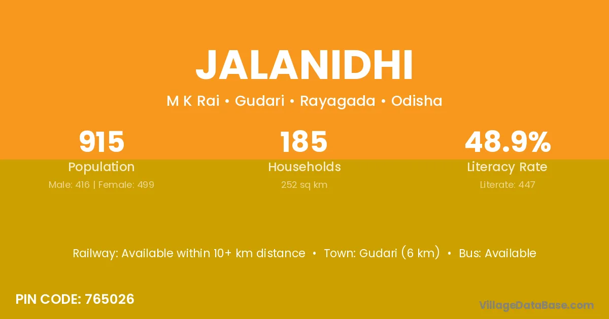 Gudari (6 km) is the nearest town to Jalanidhi village for major economic activities and is located approximately 6 km away.