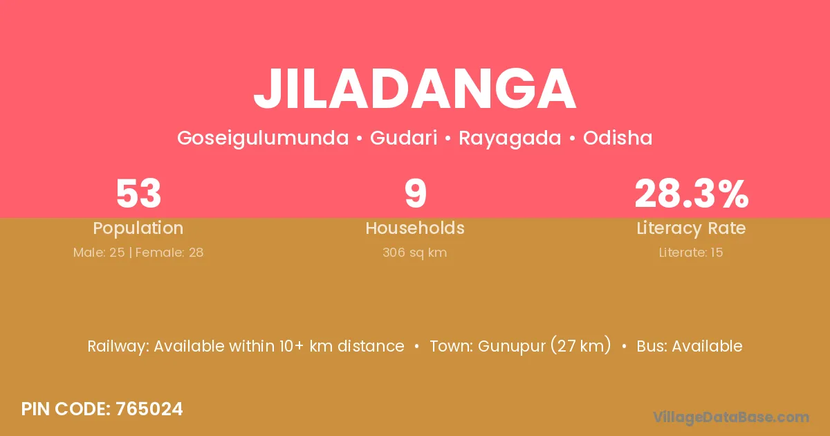 Gunupur (27 km) is the nearest town to Jiladanga village for major economic activities and is located approximately 27 km away.