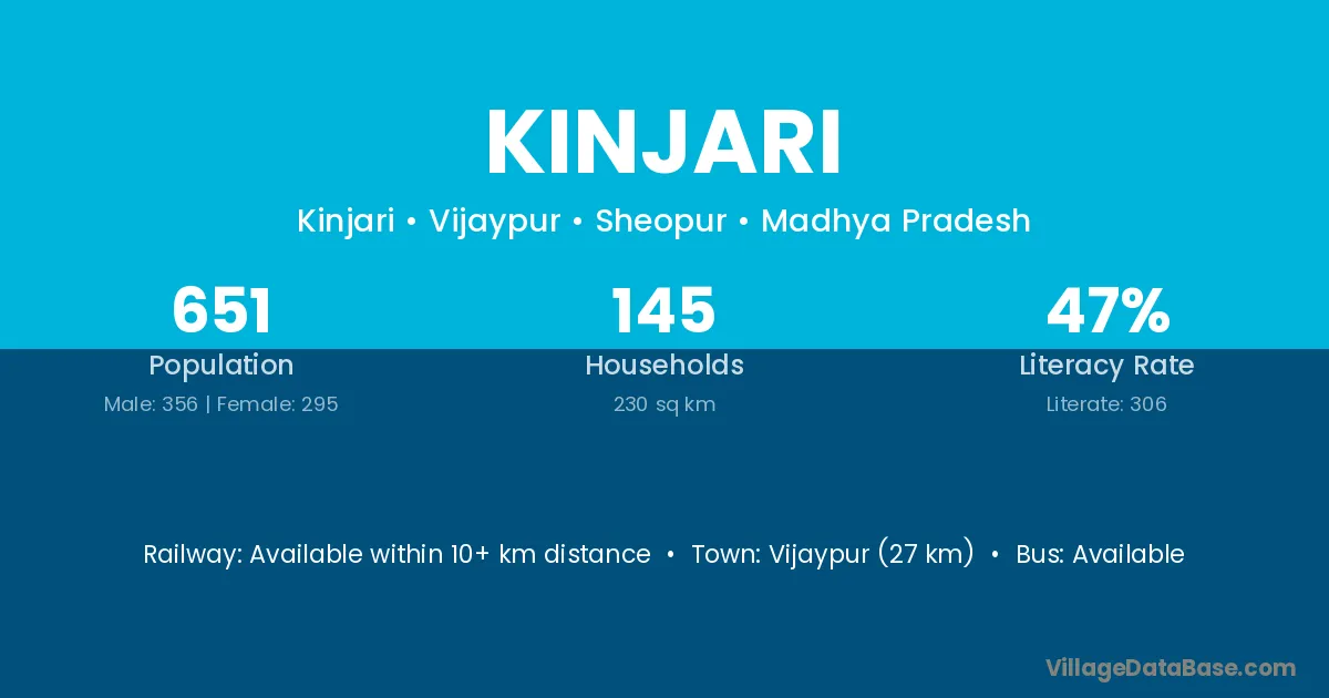 The literacy rate of Kinjari village is 15.00%. Male literacy stands at 24.49% and female literacy at 5.88%.