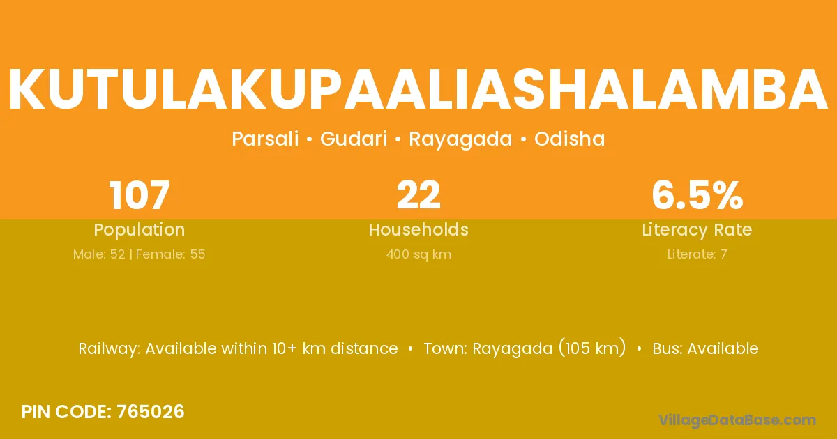 Rayagada (105 km) is the nearest town to Kutulakupaaliashalamba village for major economic activities and is located approximately 105 km away.