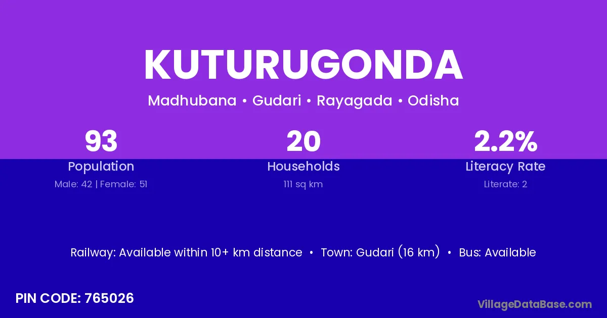 Gudari (16 km) is the nearest town to Kuturugonda village for major economic activities and is located approximately 16 km away.