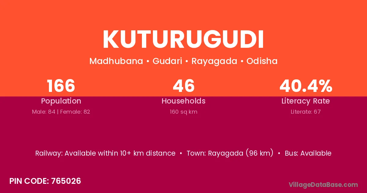 Rayagada (96 km) is the nearest town to Kuturugudi village for major economic activities and is located approximately 96 km away.