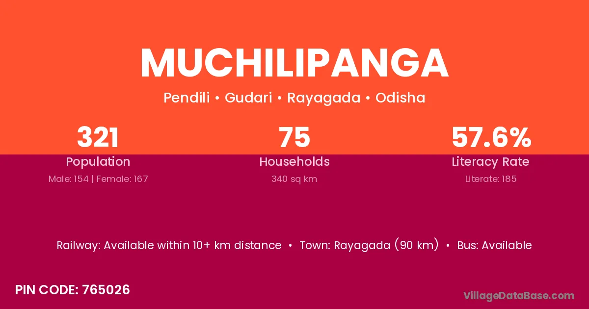 Rayagada (90 km) is the nearest town to Muchilipanga village for major economic activities and is located approximately 90 km away.