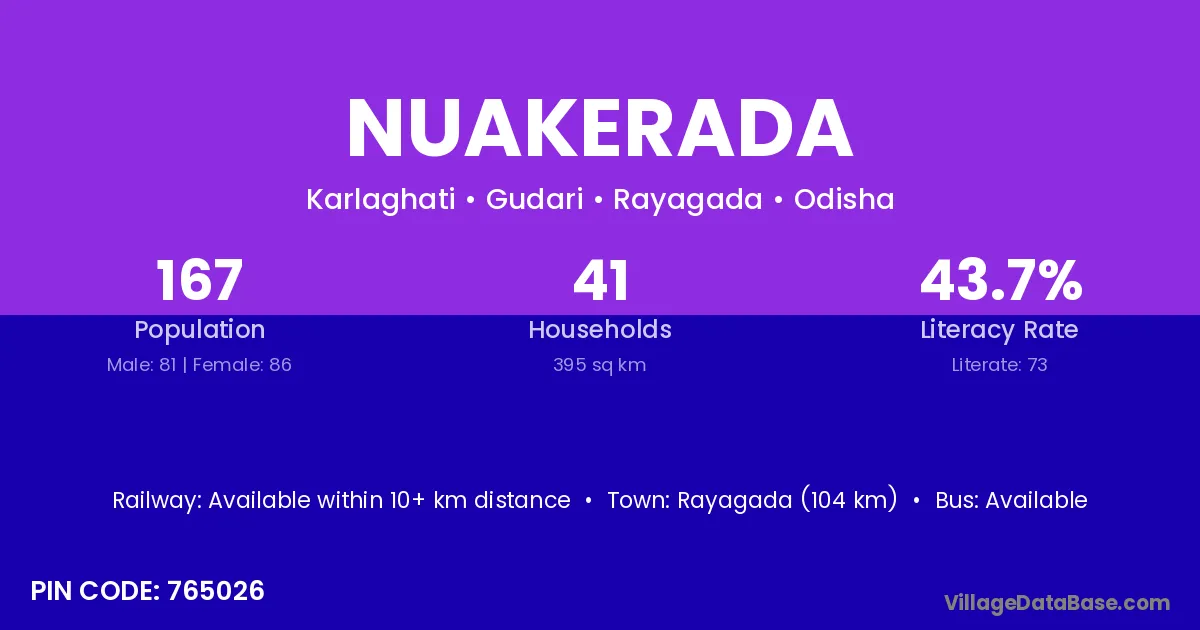 Rayagada (104 km) is the nearest town to Nuakerada village for major economic activities and is located approximately 104 km away.
