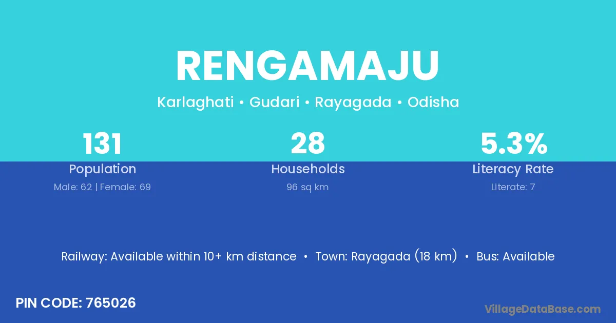 Rayagada (18 km) is the nearest town to Rengamaju village for major economic activities and is located approximately 18 km away.
