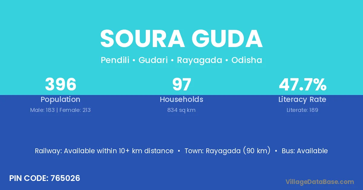 Rayagada (90 km) is the nearest town to Soura Guda village for major economic activities and is located approximately 90 km away.