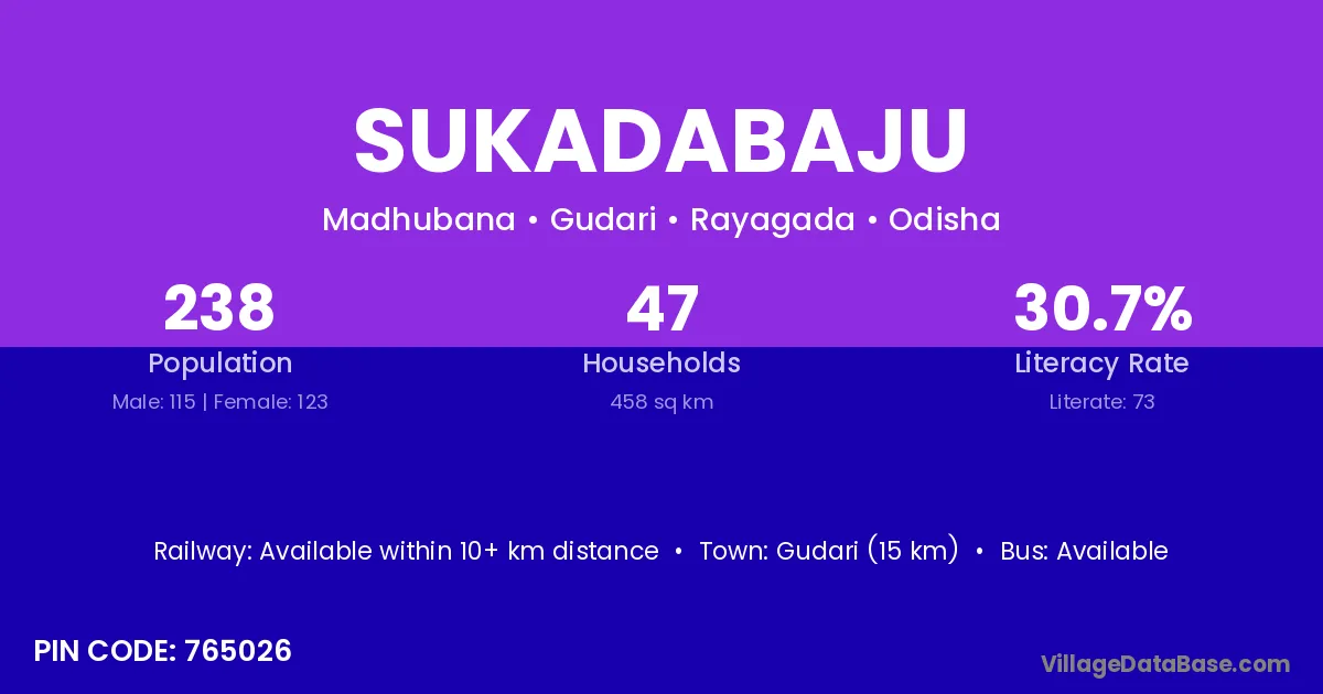 Gudari (15 km) is the nearest town to Sukadabaju village for major economic activities and is located approximately 15 km away.