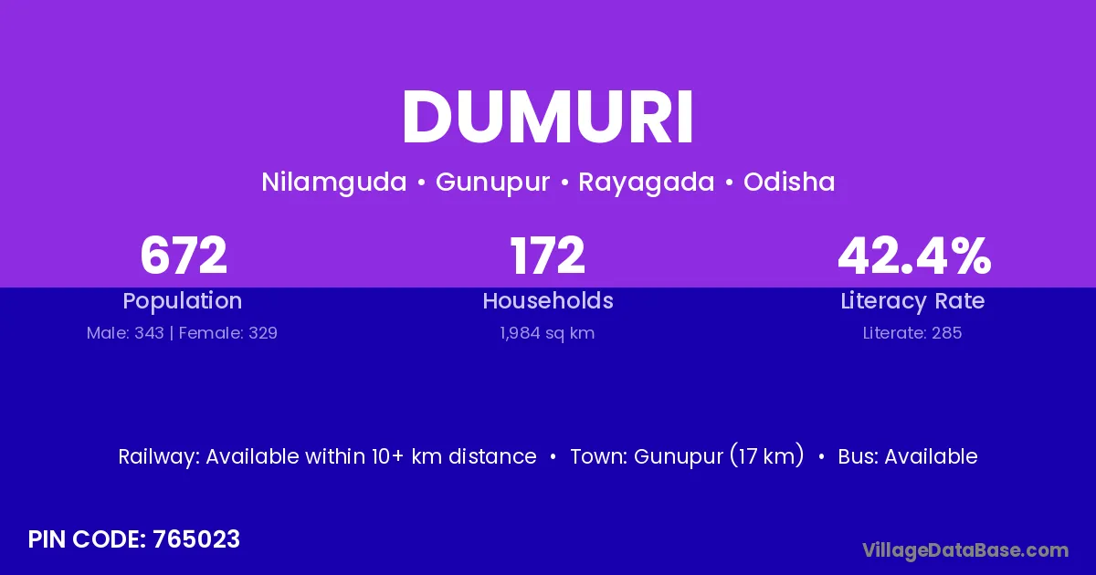 Gunupur (17 km) is the nearest town to Dumuri village for major economic activities and is located approximately 17 km away.