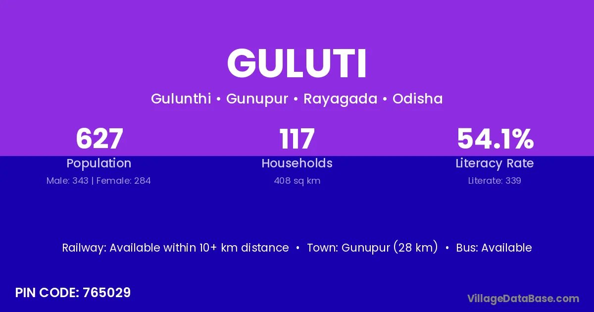 Gunupur (28 km) is the nearest town to Guluti village for major economic activities and is located approximately 28 km away.