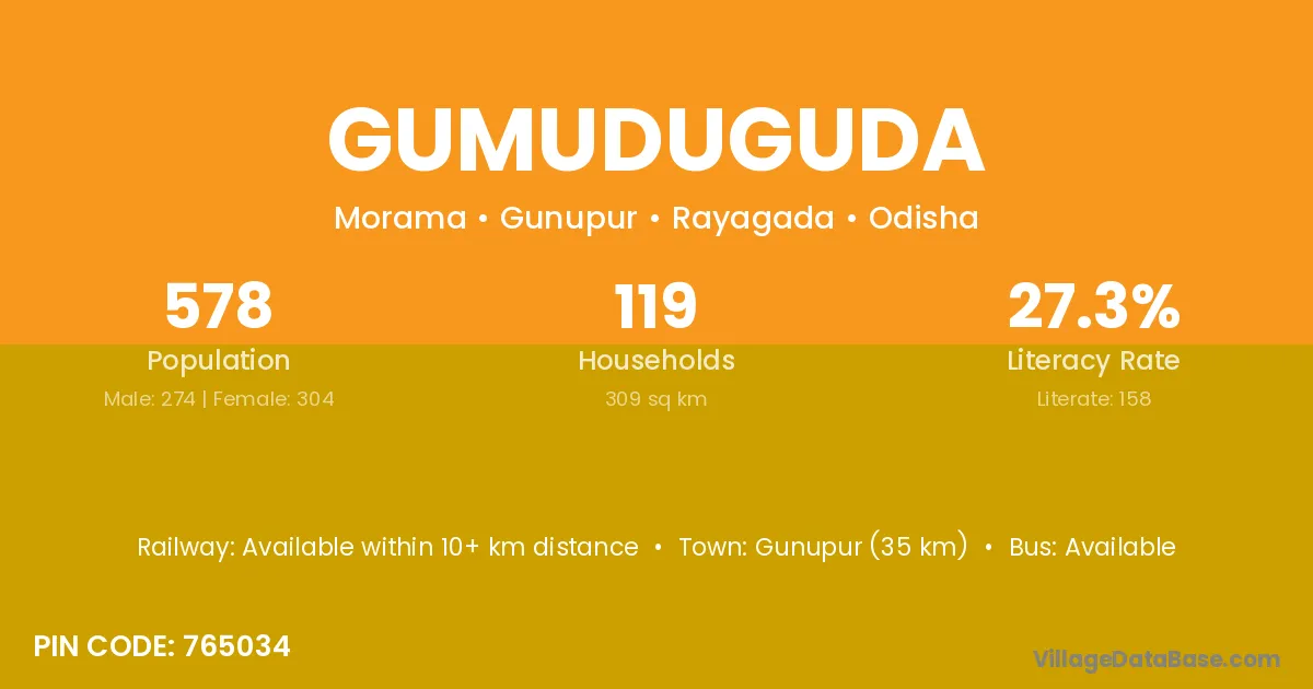 Gunupur (35 km) is the nearest town to Gumuduguda village for major economic activities and is located approximately 35 km away.