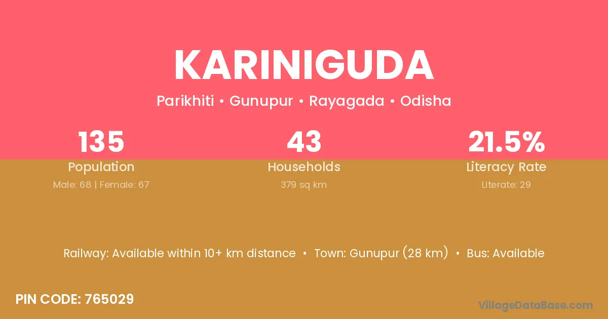 Kariniguda village has a total population of 135 people, of which 68 are males and 67 are females.