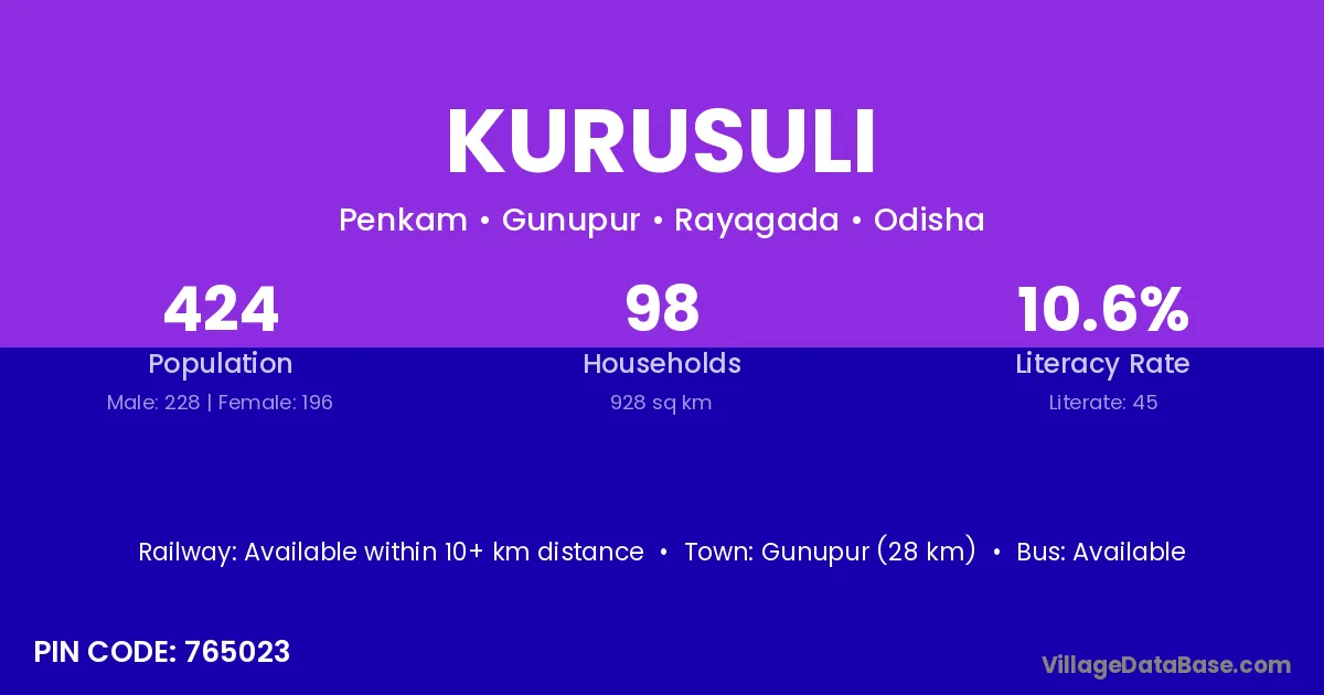 Gunupur (28 km) is the nearest town to Kurusuli village for major economic activities and is located approximately 28 km away.