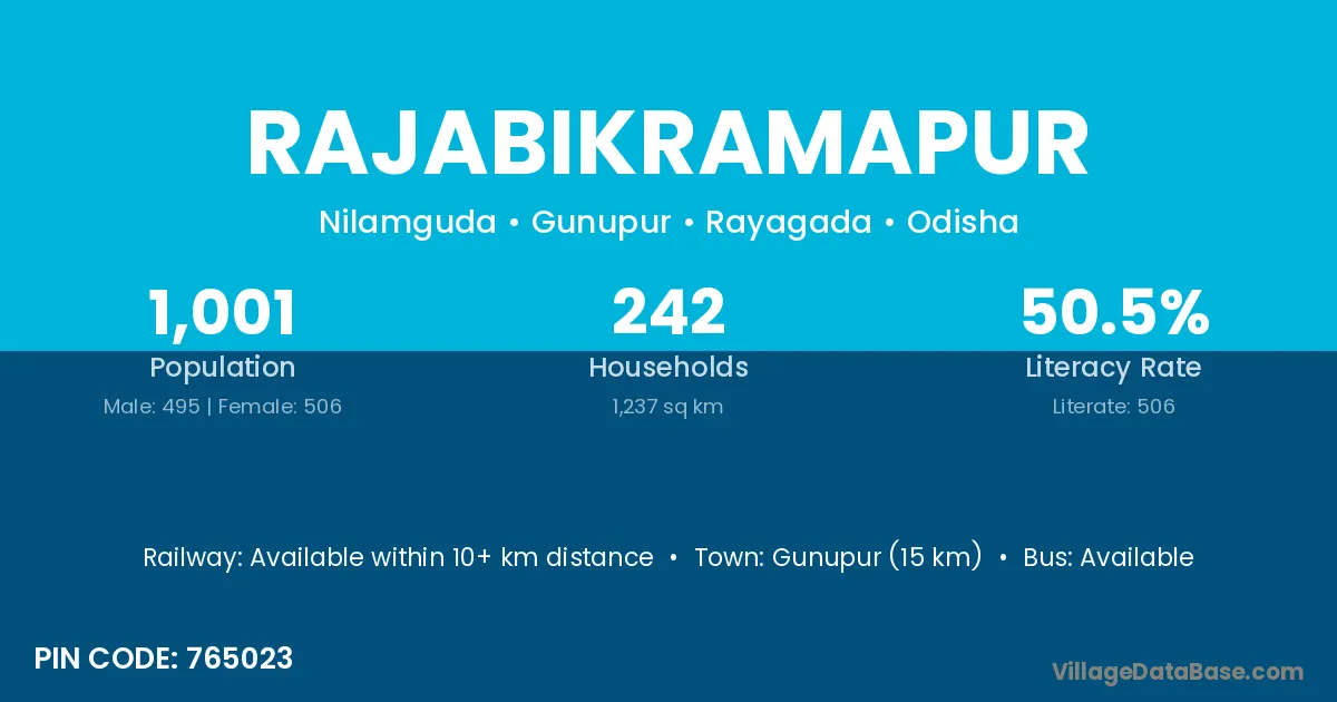 Gunupur (15 km) is the nearest town to Rajabikramapur village for major economic activities and is located approximately 15 km away.