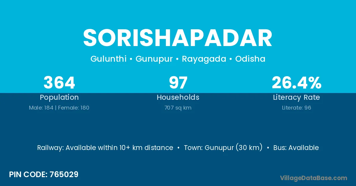 Gunupur (30 km) is the nearest town to Sorishapadar village for major economic activities and is located approximately 30 km away.