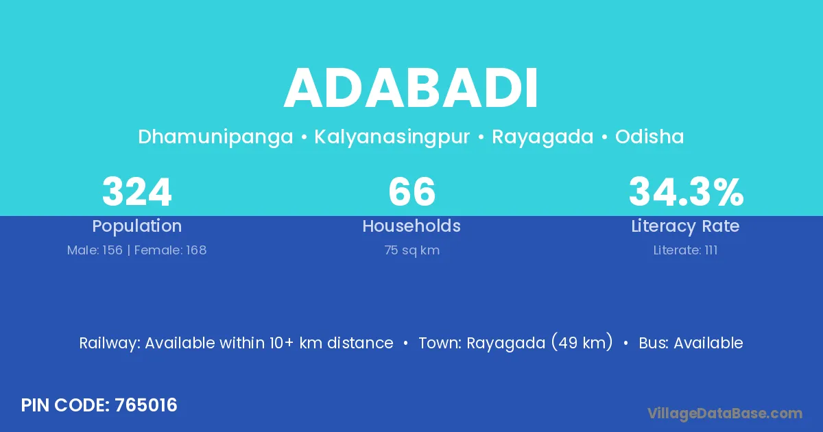 Rayagada (49 km) is the nearest town to Adabadi village for major economic activities and is located approximately 49 km away.