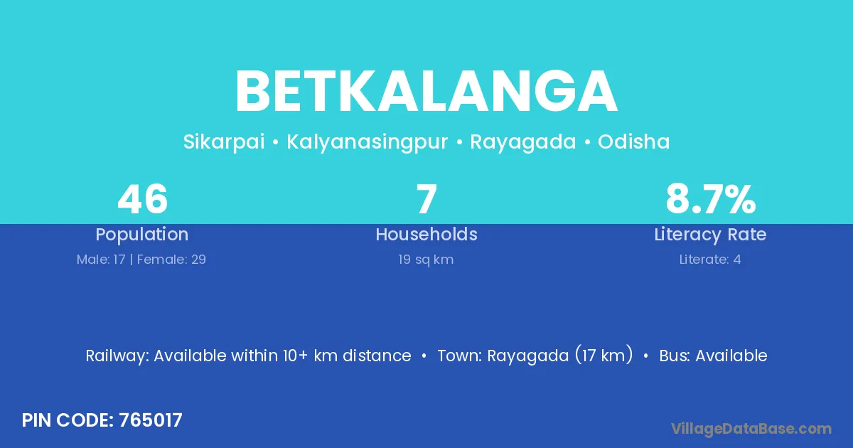 Rayagada (17 km) is the nearest town to Betkalanga village for major economic activities and is located approximately 17 km away.