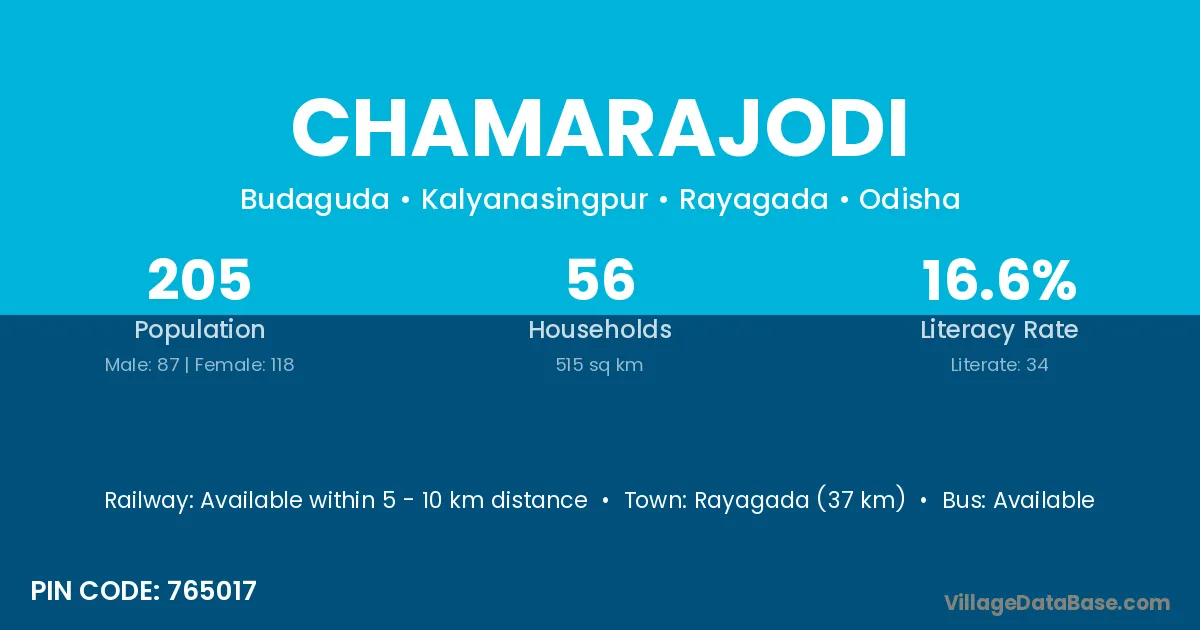 Rayagada (37 km) is the nearest town to Chamarajodi village for major economic activities and is located approximately 37 km away.