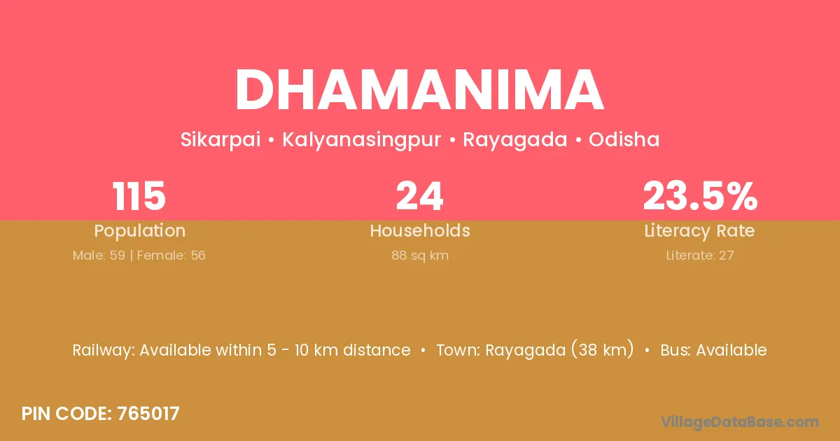 Rayagada (38 km) is the nearest town to Dhamanima village for major economic activities and is located approximately 38 km away.