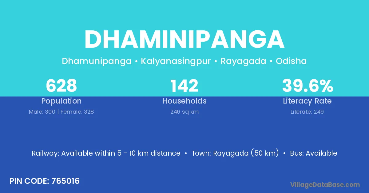 Rayagada (50 km) is the nearest town to Dhaminipanga village for major economic activities and is located approximately 50 km away.