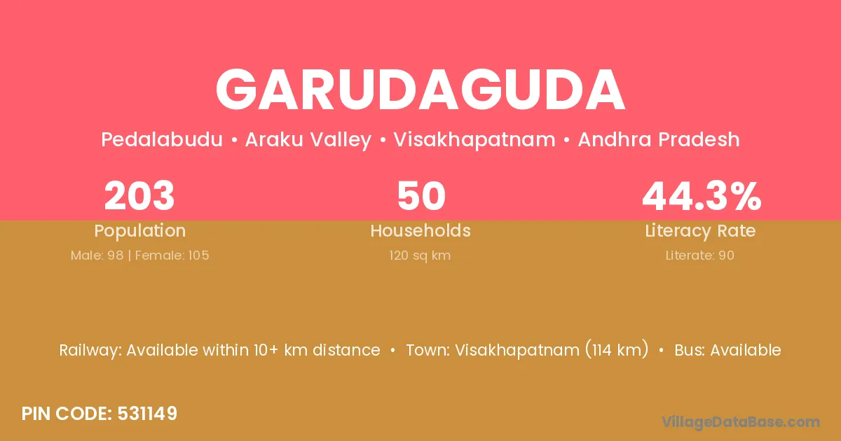 Rayagada (65 km) is the nearest town to Garudaguda village for major economic activities and is located approximately 65 km away.
