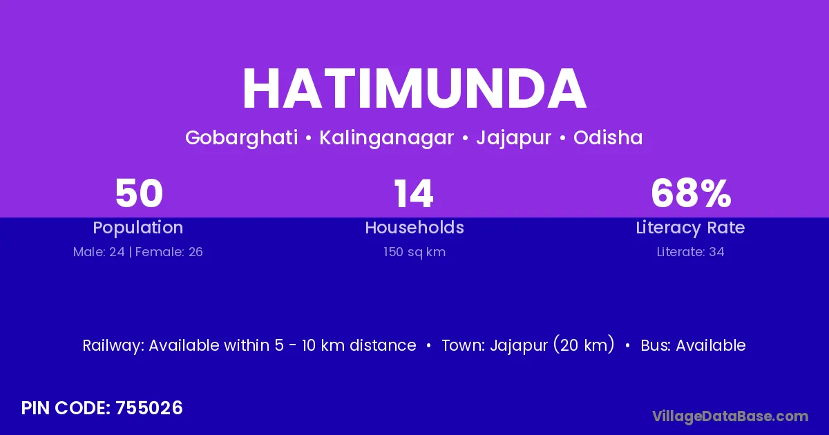 Rayagada (58 km) is the nearest town to Hatimunda village for major economic activities and is located approximately 58 km away.